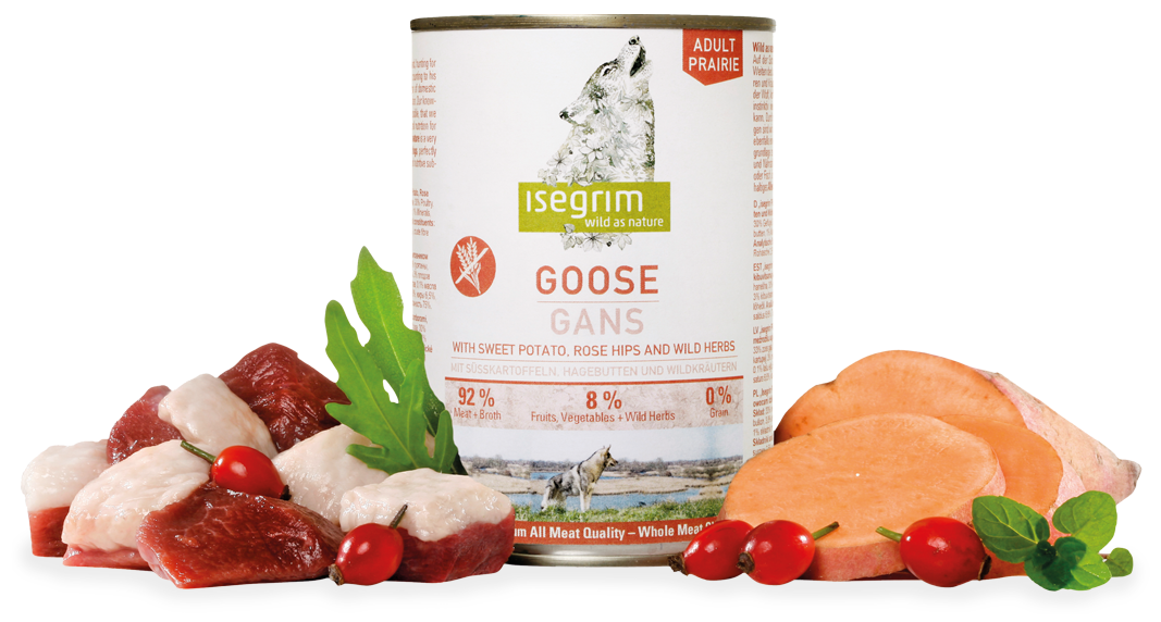 Meso in živalski derivati (33 % gosje, 30 % perutnina), mesna juha (29 %), zelenjava (3,8 % sladkim krompirjem), sadje (3 % šipkom), minerali (1 %), zelišča (0,1 %), olja in maščobe (0,1 %, lososovo olje).